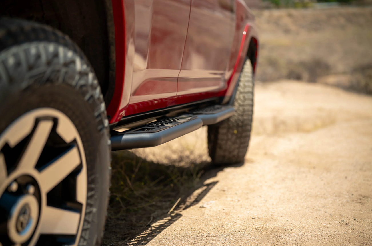 Our OE Plus 5th Gen 4Runner Side Steps combine off-road utility and a rugged styling for the perfect upgrade to your rig. The steps feature gripped top plates for an anti-slip design that prevents slippage when entering or exiting your vehicle when in slippery conditions. They retain your 4Runner’s factory side clearance, so you can continue adventuring on your favorite technical trails. Our steps help shield your rocker panels from rocks & dirt kicked up by your tires and branches lining the trail. The side steps fully bolt-on to the body/pinch weld for a sturdy fitment. Our steps are made from durable steel, and are finished in a sleek micro-texture black powder coat that complements your 4Runner’s exterior styling. With our OE Plus Side Steps, you can enjoy secure footing and side protection without lost ground clearance when venturing off-road.