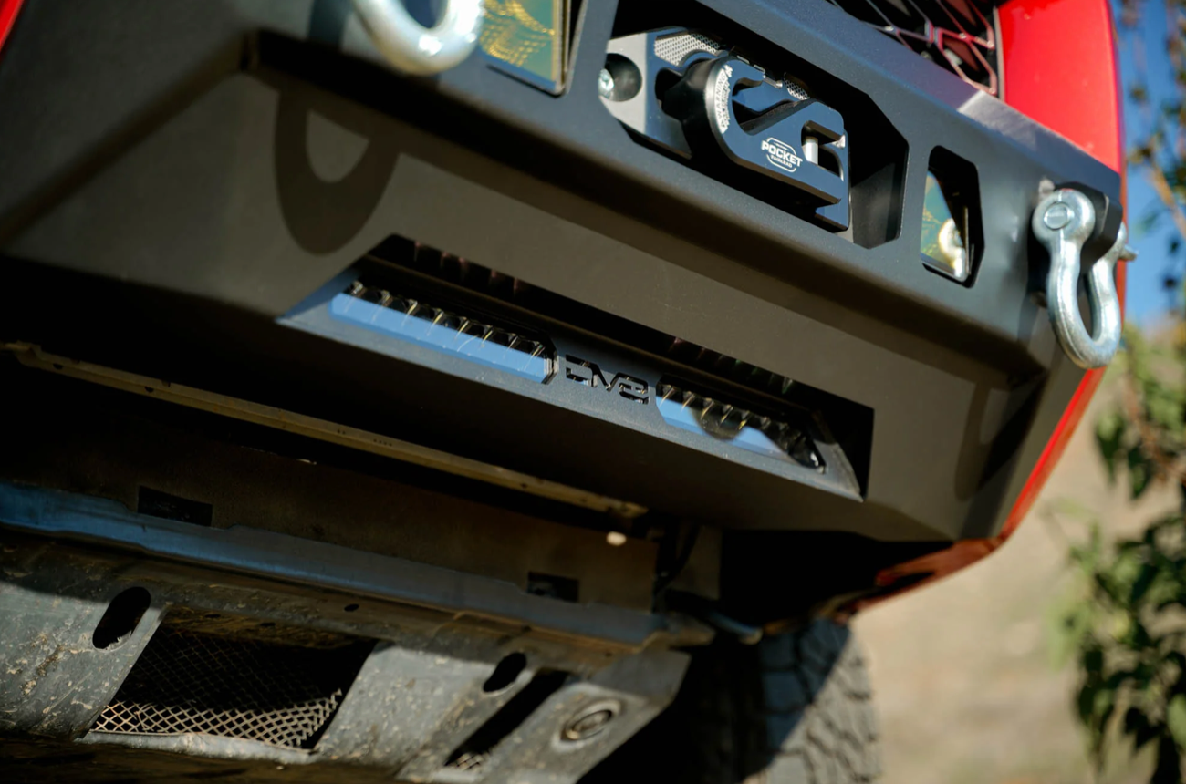 Our Centric Series 5th Gen 4Runner Winch Front Bumper features a mid-width design that complements the iconic style of the front end. A hidden winch mount that accepts multiple size winches and 1-inch thick D-ring mounts provide ample recovery options. A recessed light mount for 20-inch single row light bars sits at the center of the bumper. Additional lighting provisions include (2) 3-inch pod light mounts. Note that if you install the pod lights, you will need a winch with a wireless remote as the pods will block access. Welded zip-tie tabs provide for clean wire management behind the bumper.