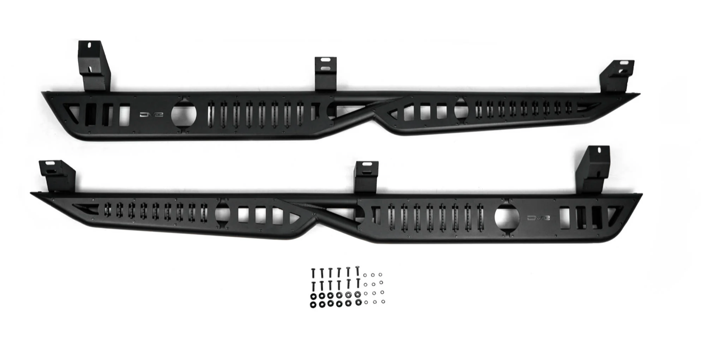 Our 3rd Gen Tacoma OE Plus Steps mount to your body/pinch weld for a secure step that aids in entering and exciting your truck. The steps feature a textured anti-slip design that provides excellent grip when in wet or sandy conditions. They also offer protection from light trail debris such as branches and small rocks that get kicked up by your tires. The steps trim design gives you a functional step without losing ground clearance when on rocky trails. They are made from durable 3mm/4mm steel, and are finished in a resilient micro-texture black powder coat that accents your Tacoma’s sleek exterior. The side steps are fully bolt-on for a quick and easy install process. DV8’s OE Plus Side Steps combine both style and functionality to provide the perfect addition for your off-road rig.