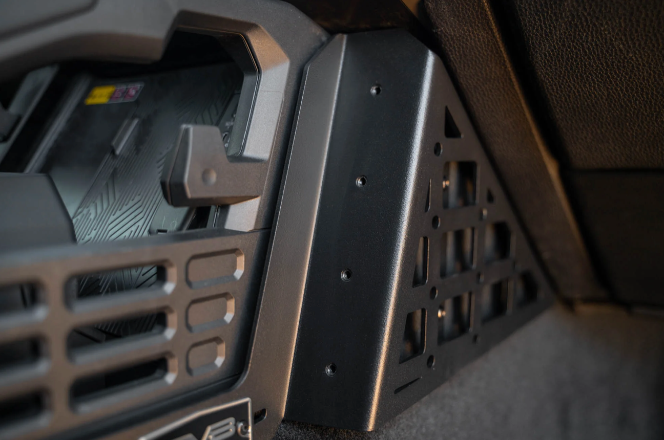 These molle panels retain use of the factory cup holders & passenger side grab handle, and they bolt-on to the sides of your console with only some minor drilling required for installation. The panels are made from high-quality 3.5mm steel for a rigid design that will keep your gear secure even when jostled on rough terrain. They are finished in a micro-texture black powder coat that compliments your Tacoma’s interior styling.