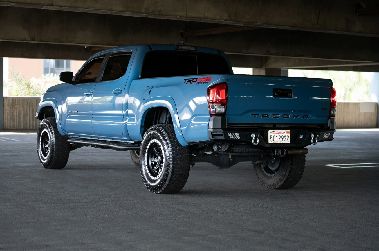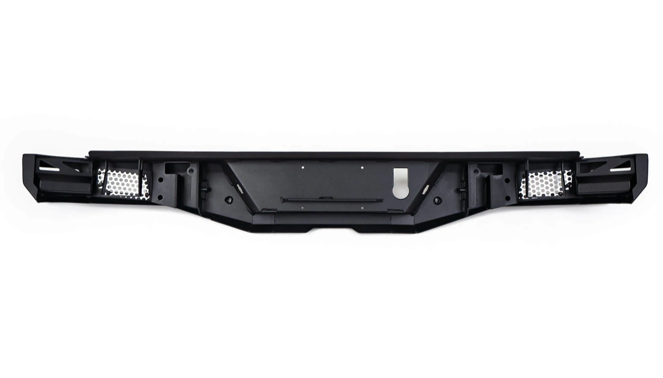 Our low profile MTO Series Tacoma Rear Bumper was designed as a direct replacement to the factory bumper, with no cutting or modification required for installation. It brings the addition of 2 reinforced clevis mounts that take ¾-inch D-rings, providing you with recovery options. A 3-inch light pod can be mounted behind the aluminum mesh panels towards each end of the bumper. These panels can be removed and painted, or left in their raw aluminum color.