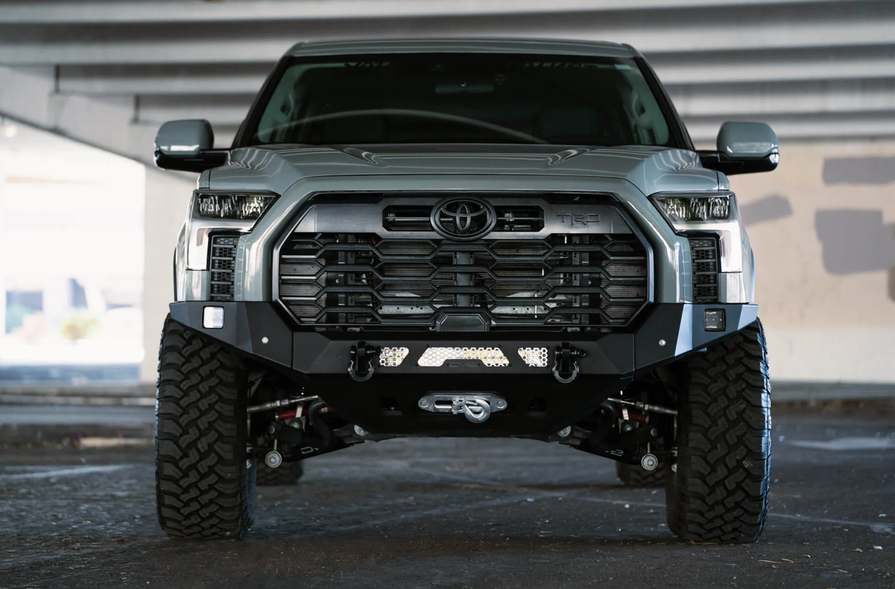 Engineered for the 3rd Gen Tundra, our MTO Series Winch Front Bumper brings added utility and style to your truck. The high clearance design ensures improved approach angles, allowing you to get over most terrain with ease. With cutouts and light mounts for two 3-inch light pods, plus a central mount behind the aluminum accent panel for a 20-inch dual row light bar, you can customize your look and light up your path. The hidden winch mount along with two ¾-inch D-ring shackle mounts provides you options if a recovery situation arises on one of your off-road adventures. Best of all, this bumper is compatible with factory skid plates across all trims including the TRD package, so you won’t have to worry about interference or fitment.