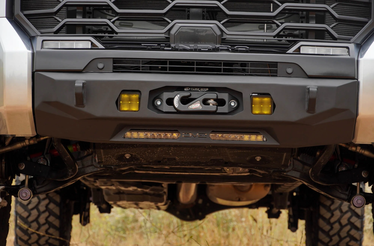 The bumper sits in a low profile, retaining the factory approach angle. Our design retains all nearby factory features, including adaptive cruise control, and parking sensors. The Centric Tundra Bumper is also compatible with all factory skid plates. Installation requires minor cutting of the center bumper cover, but its narrow width prevents the need to cut into the wraparound front fenders.