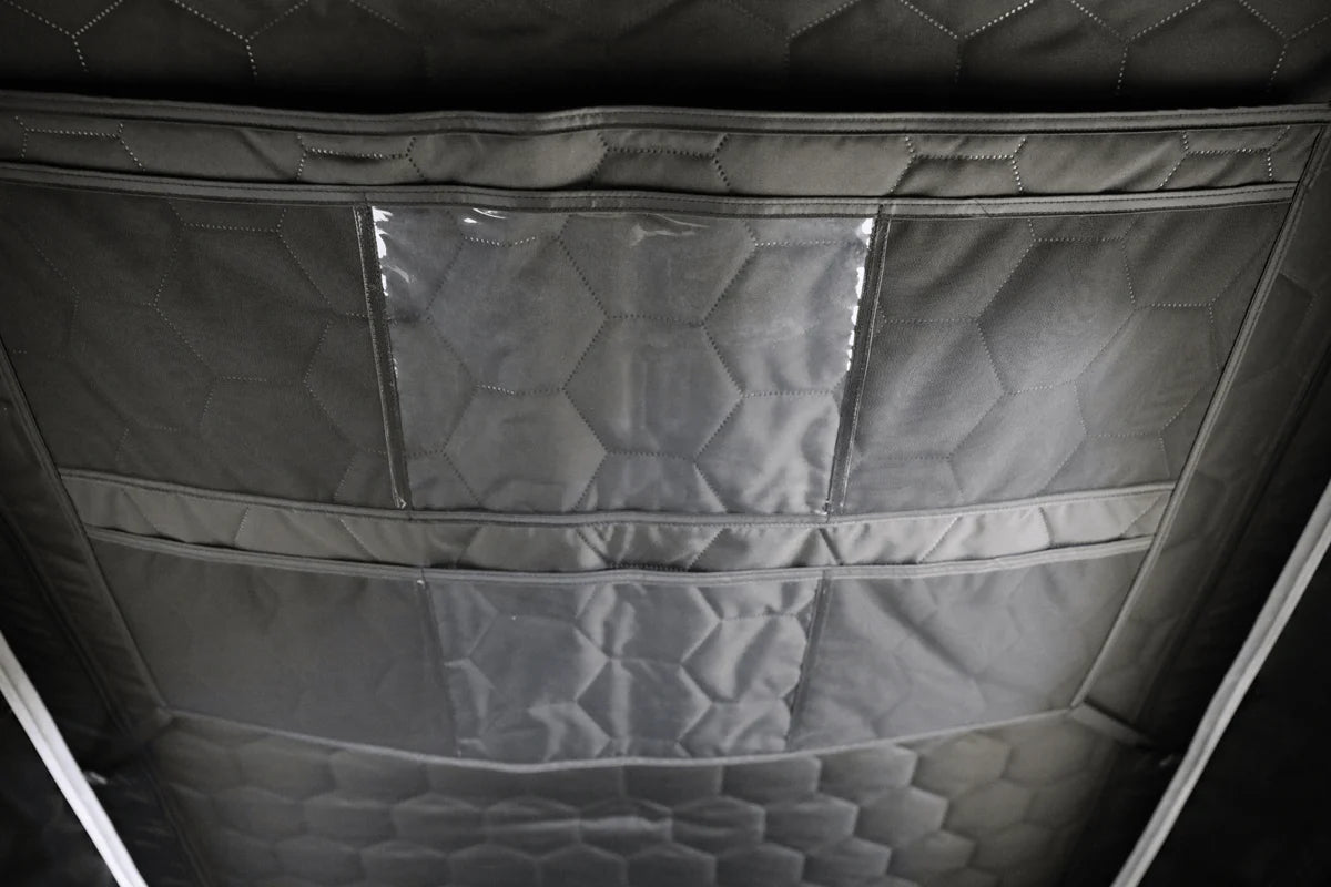 Oxford canvas ripstop FSR Tech Fabric and proprietary Tri-layer (polycotton fill sandwiched between two layers of 210D ripstop) on windows, doors & ceiling