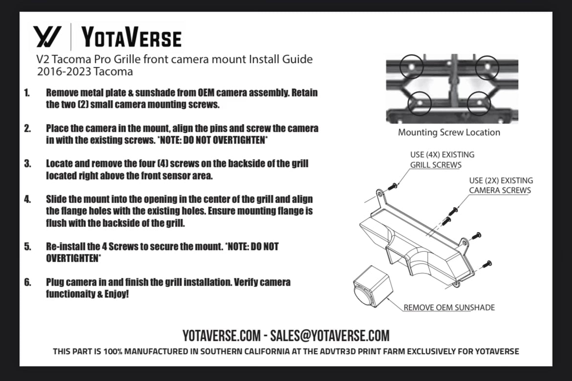Please note- This will only fit our V2 Pro Grille and only works with the OEM Toyota forward facing camera.